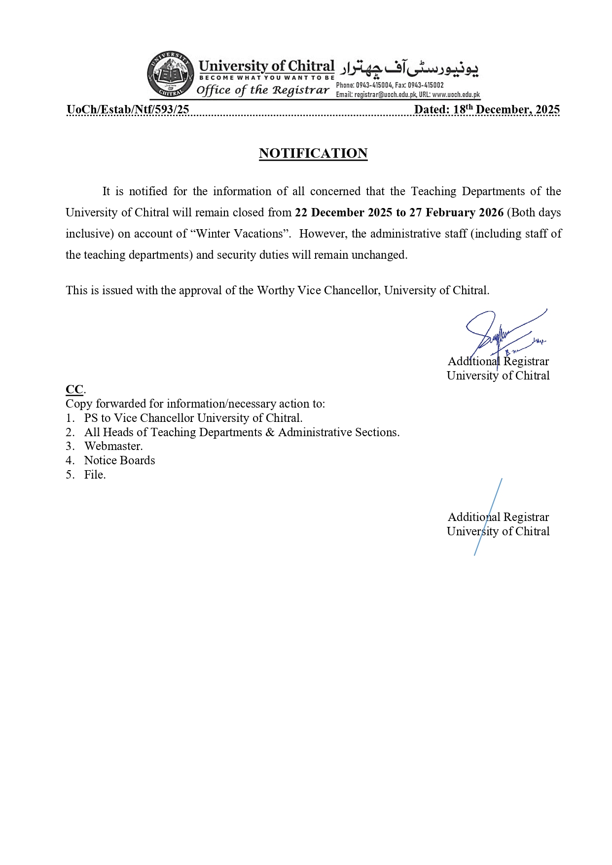• University of Chitral will remain closed on account of "Quid-eAzam Day" on Thursday 25th December 2025