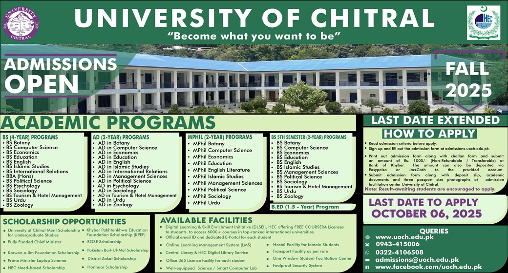 Welcome to the University of Chitral-a new established public sector university in Khyber Pakhtunkhwa, Pakistan. Our mission goes beyond simply classroom teaching and basic research-we strive to provide an academic environment that encourages dialogue, critical thinking, innovation and respect for diversity and inclusiveness. Our faculty is committed to excellence in teaching, research, and community engagement-bringing real-world experience into the classroom.